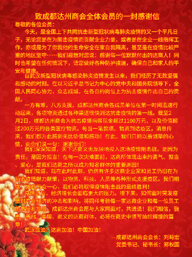 疫情过后,经济增长会面临更大的压力。接下来,如何面对突发疫情对产业经济的冲击和影响,将同样考验每一家达商企业和每一位员工的责任和担当。成都达州商会愿与大家同面对,共进退!我们相信,骁勇、善战、重情、尚义的达商群体,必将在商史中谱写灿烂辉煌的篇章!