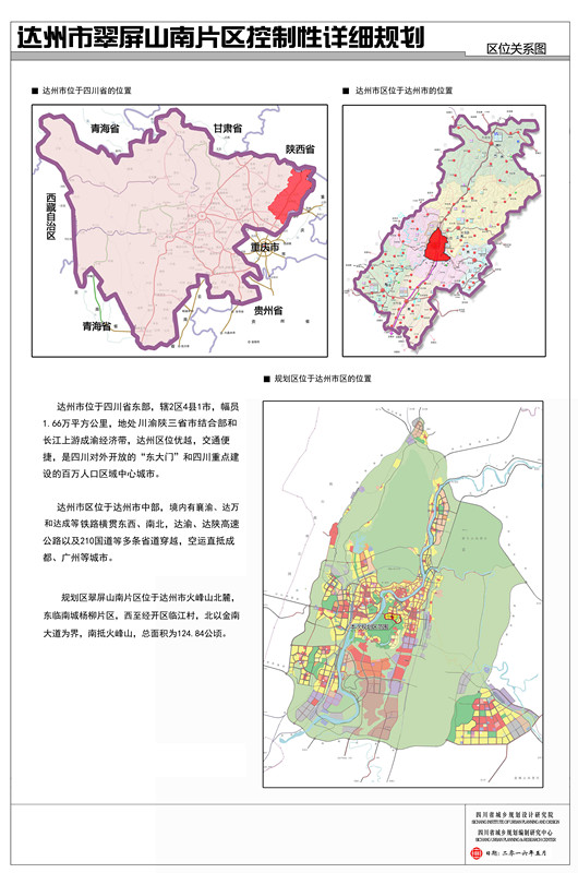 达州市翠屏山南片区位于达州市火峰山北麓,东临南城杨柳片区,西至经开区临江村,北以金南大道为界,南抵火峰山,规划区总面积为124.84公顷,其中总建设用地为98.66公顷。规划区定位为城市景观节点、城市高端居住区、火峰山城市公园配套服务区。