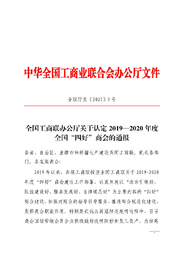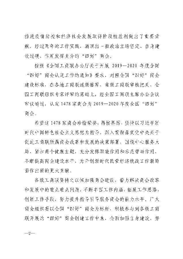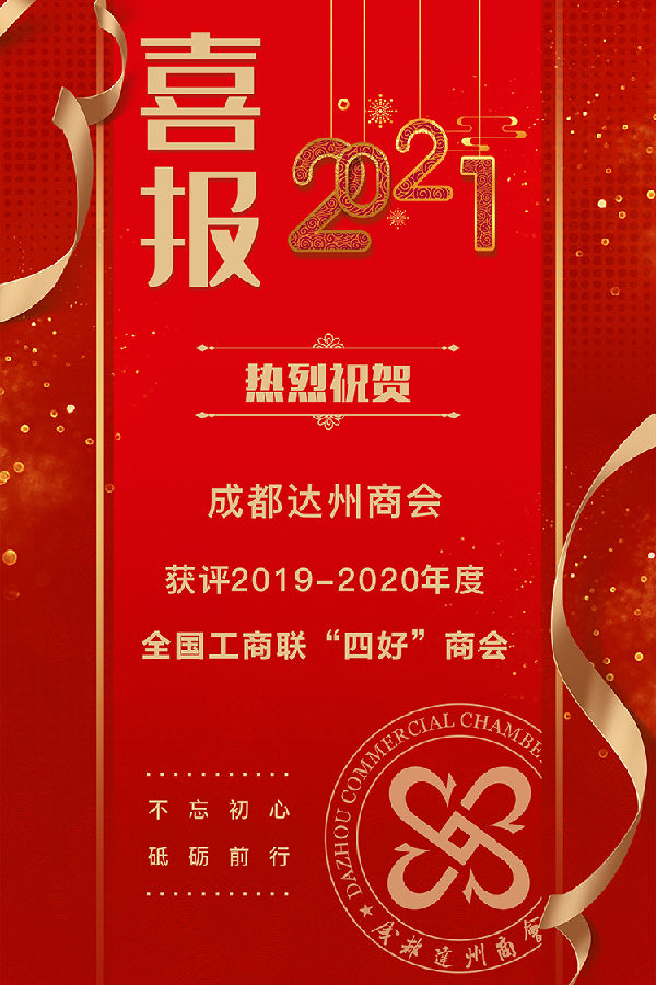 1月25日,全国工商联发出《关于认定2019—2020年度全国“四好”商会的通报》,成都达州商会被评为全国工商联“四好”商会,与全国1478 家商会共同受到通报表扬。