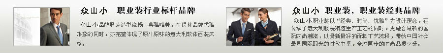 成都众山小服饰有限公司专注于职业装的设计和定做,产品包括西服、职业装、工装、校服、T恤、文化衫、酒店制服、航空公交制服、政府执法制服等,多年来成功的为各大型企业集团,银行、证券、政府职能部门、机关、学校等企事业单位提供全方位的职业装订制服务。